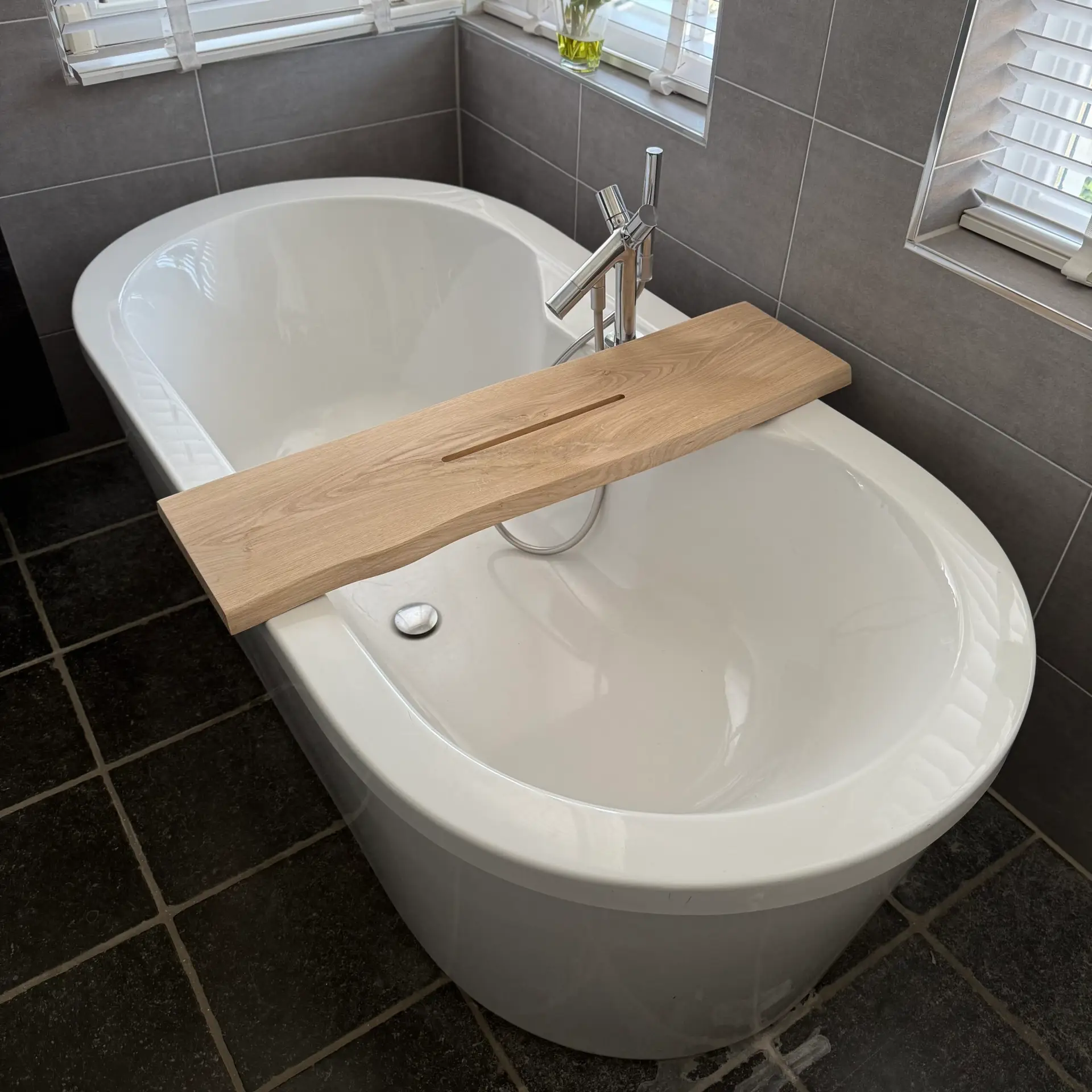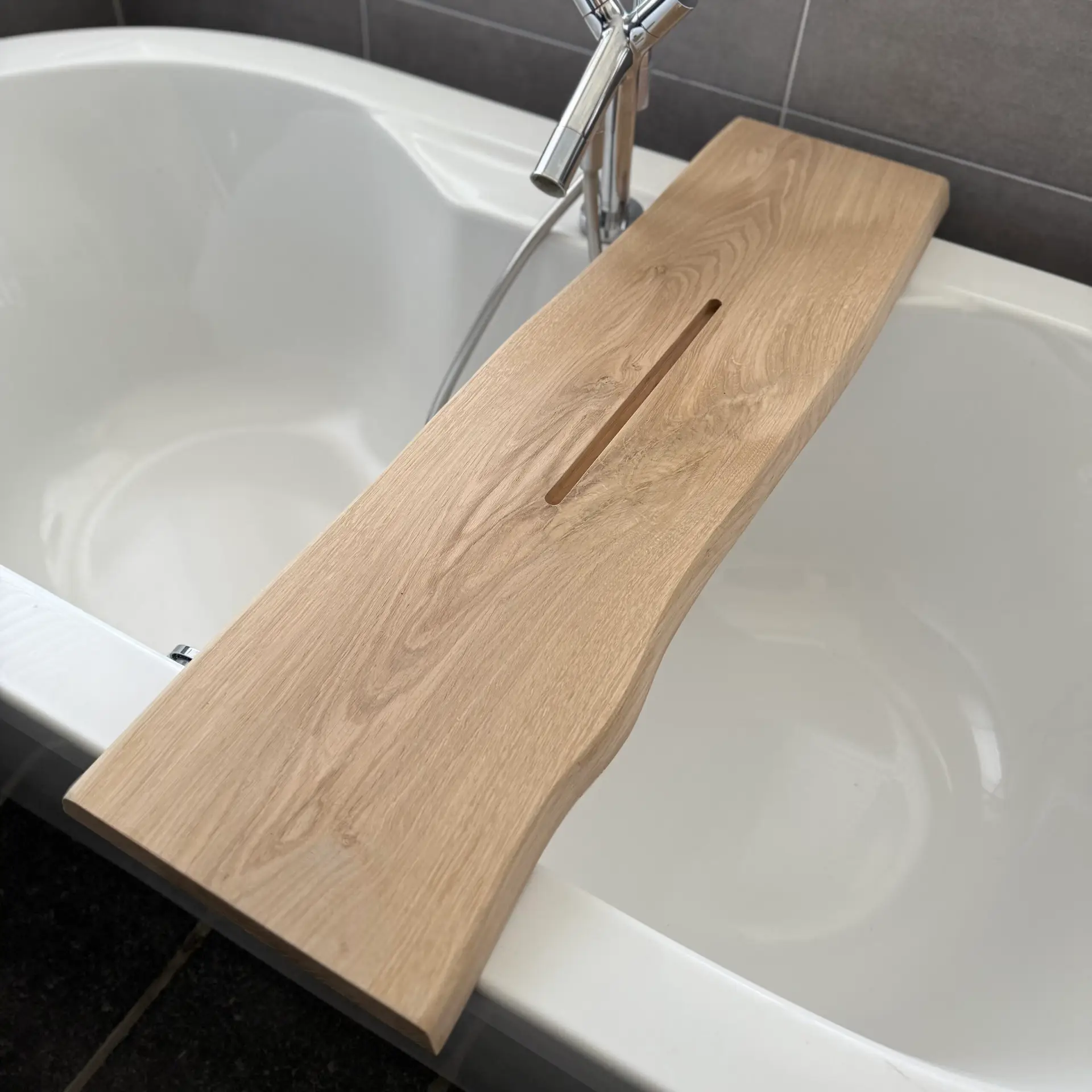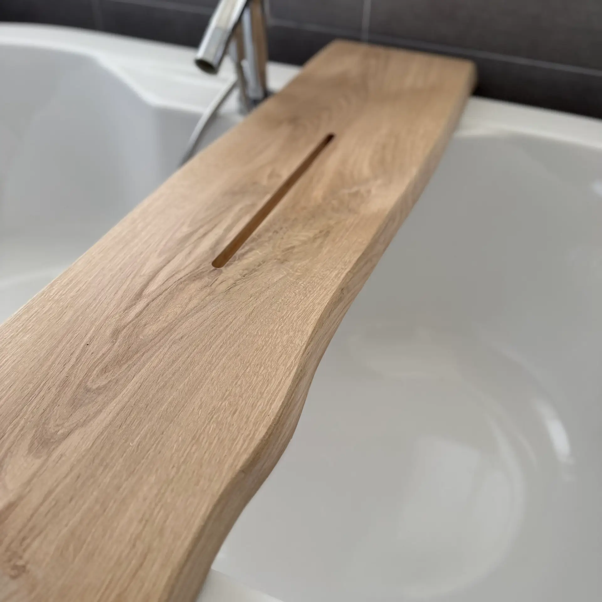 De plank heeft aan één zijde een sleuf van 36 × 1,2 × 1,5 cm om je tablet of telefoon veilig neer te zetten. De andere zijde is glad afgewerkt, zodat je beide kanten naar wens kunt gebruiken. Er blijft genoeg ruimte voor kaarsen, glazen en andere badaccessoires.