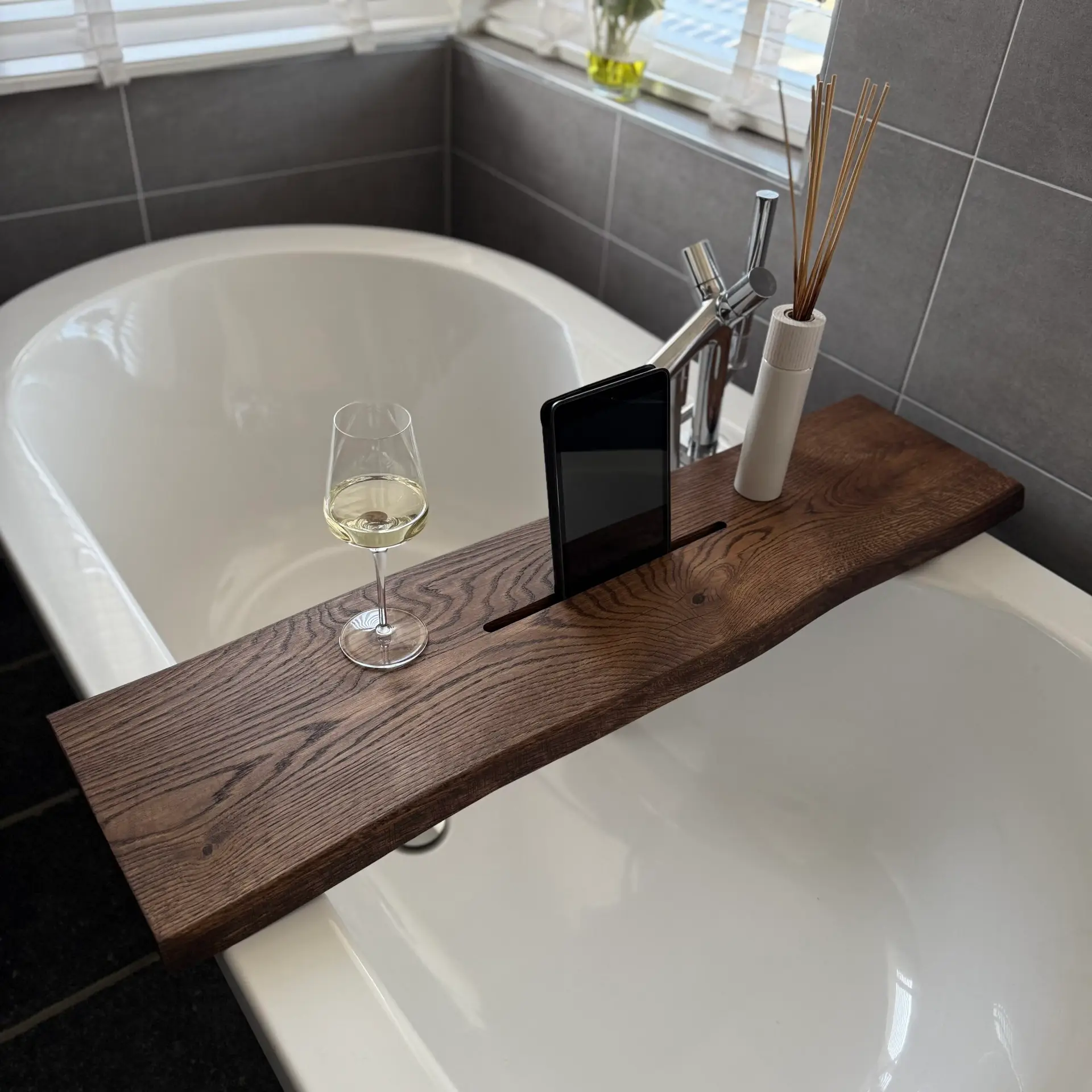 De badplank is ontworpen voor gebruiksgemak én uitstraling. Aan één zijde bevindt zich een sleuf van 36 × 1,2 × 1,5 cm om je tablet of telefoon stevig te plaatsen. Er is voldoende ruimte voor kaarsen, glazen en andere badaccessoires. De andere zijde is glad, waardoor je de plank naar wens kunt omdraaien.
