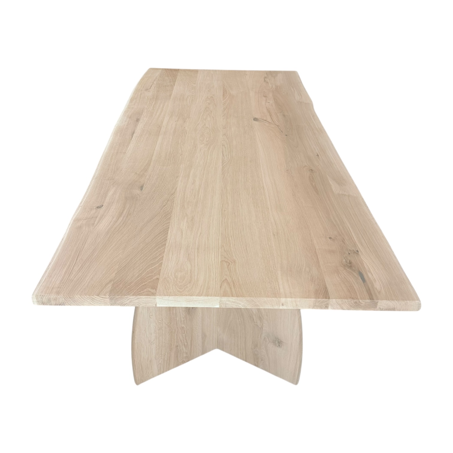 De massief eiken boomstam tafel met eiken driehoek poten van Maison DAM is een opvallende tafel, gemaakt met puur vakmanschap. Het robuuste tafelblad met licht golvende boomstamkant benadrukt de authentieke uitstraling van het eikenhout, terwijl de driehoek poten zorgen voor een modern geheel. Deze tafel past perfect in Japandi, moderne en landelijke interieurs.